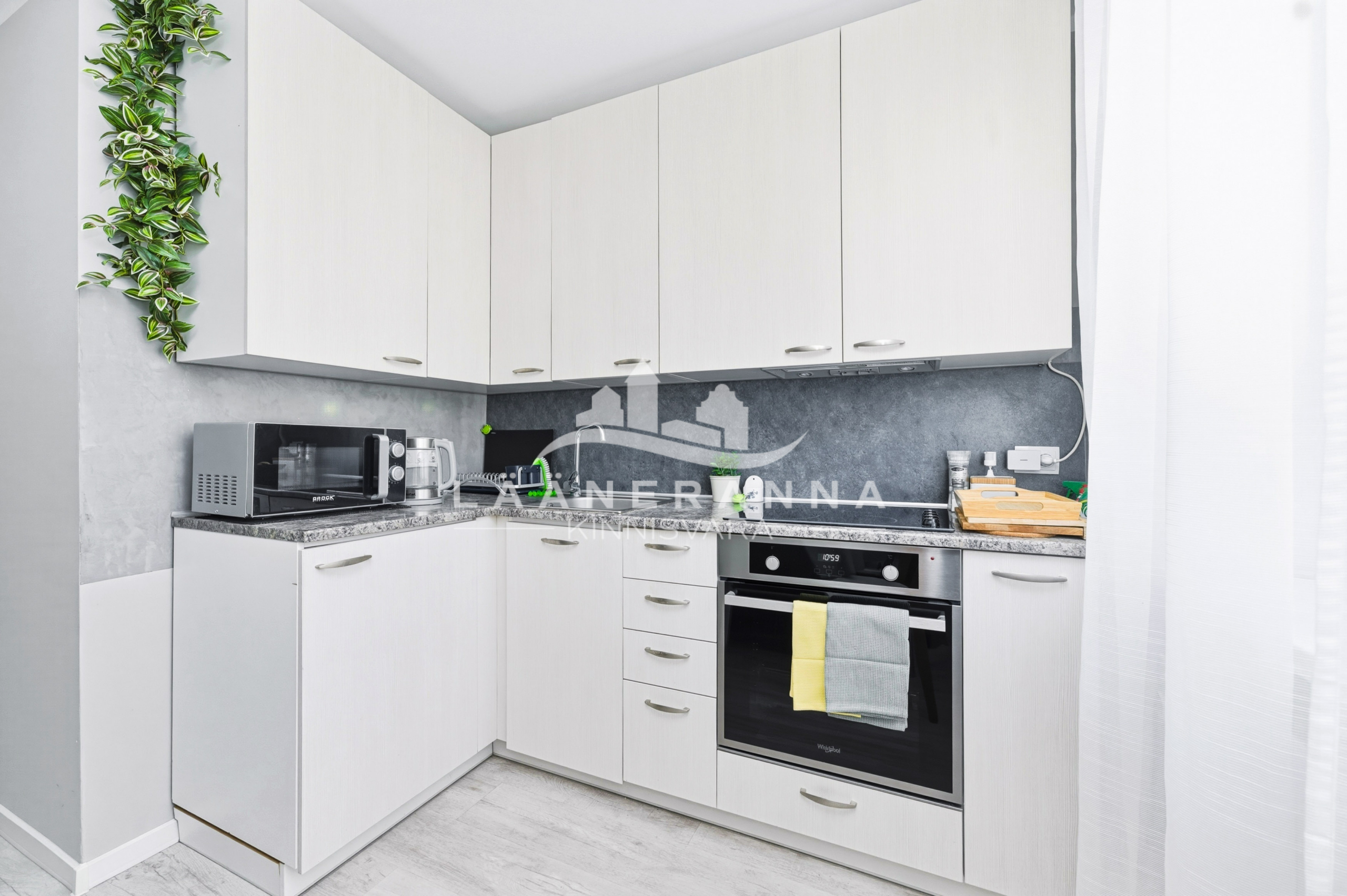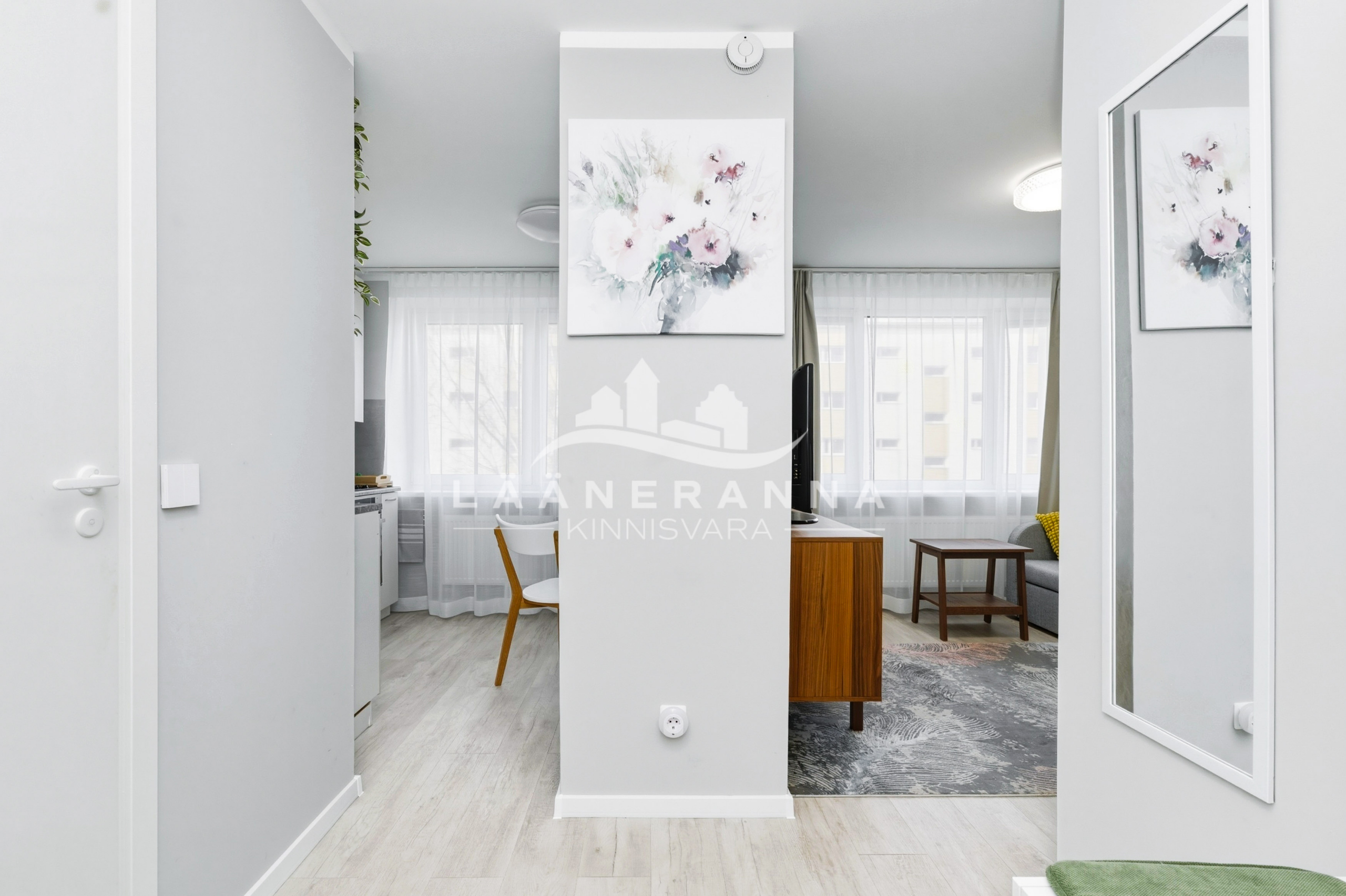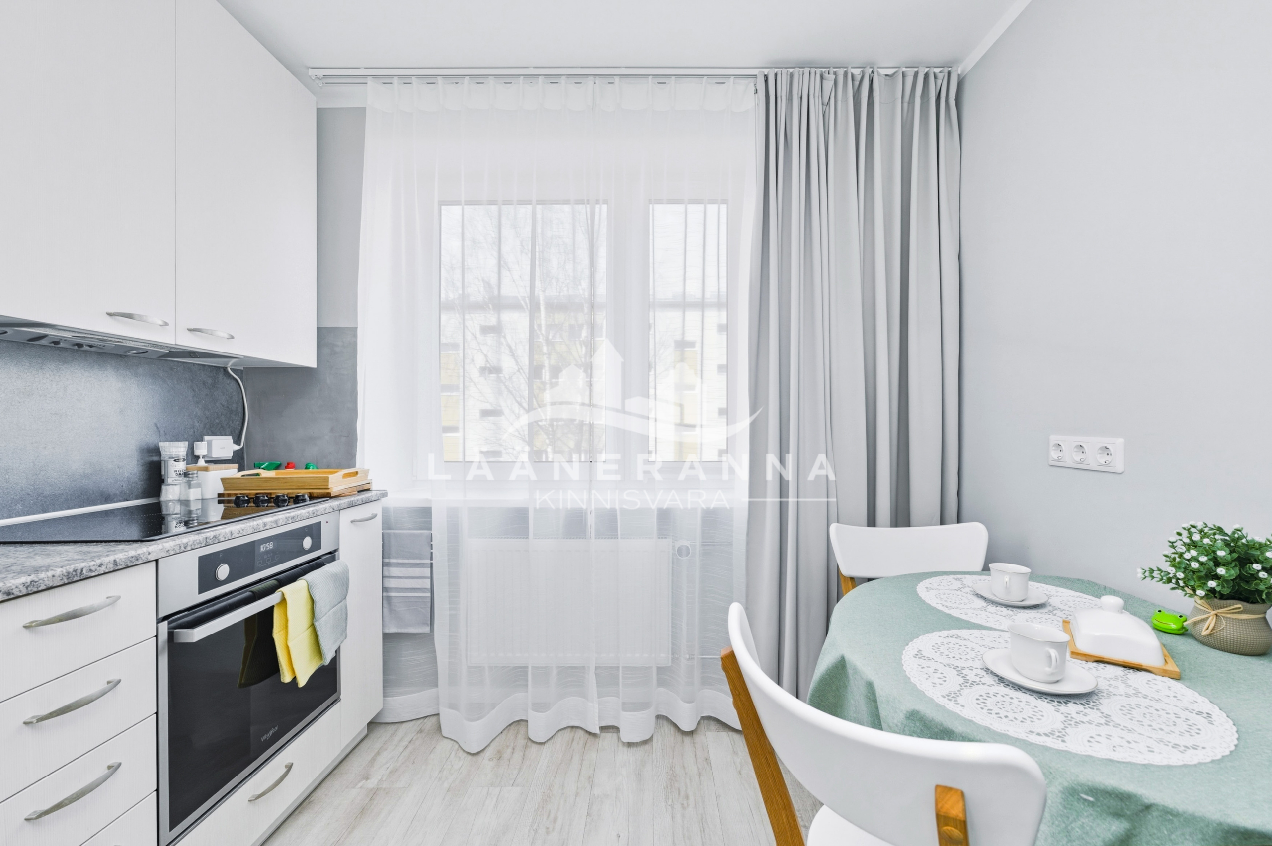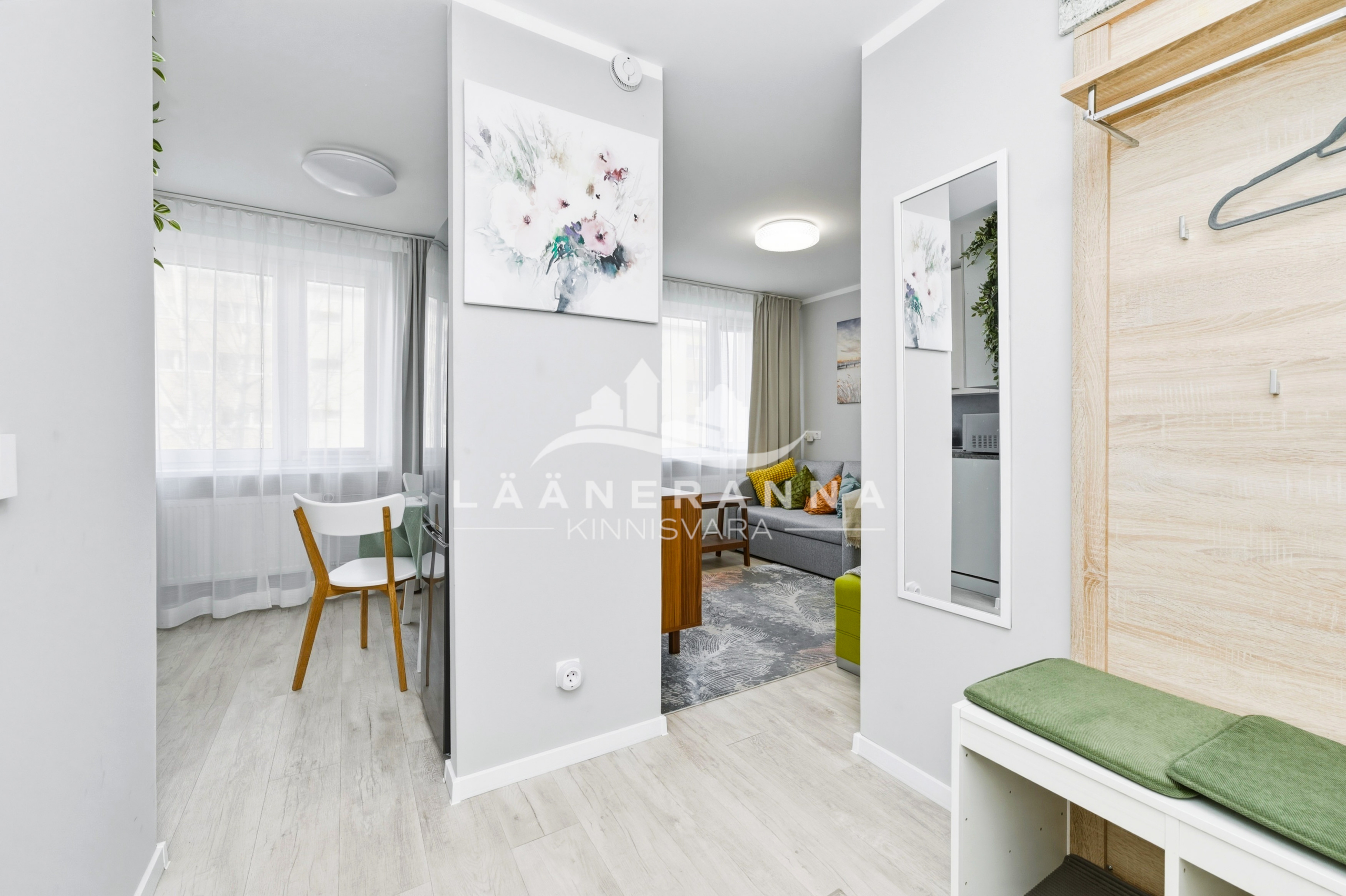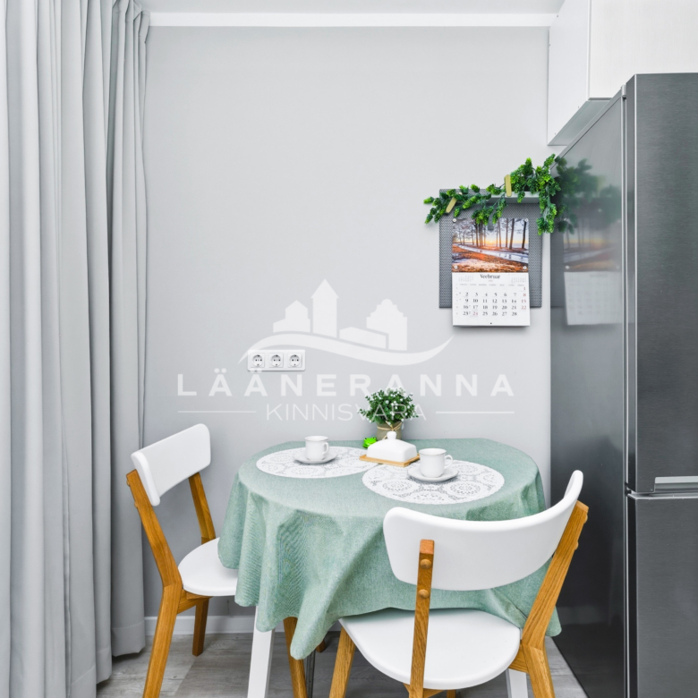 Korteris on integreeritud tehnikaga köögimööbel, toas eraldatud panipaik. WC ja duširuum asuvad koos- olemas ka pesumasin-kuivati. Põrandaid katab vastupidav LVT parkett, seinad ja laed on värvitud, seinad on soojustatud 5cm kivivillaga. Sanruum on viimistletud mikrotsemendiga, dušiala on plaaditud ning eraldatud klaasist voldikuksega. Paigaldatud on pakettaknad, metallist välisuks ning tule- ja helikindel siseuks.