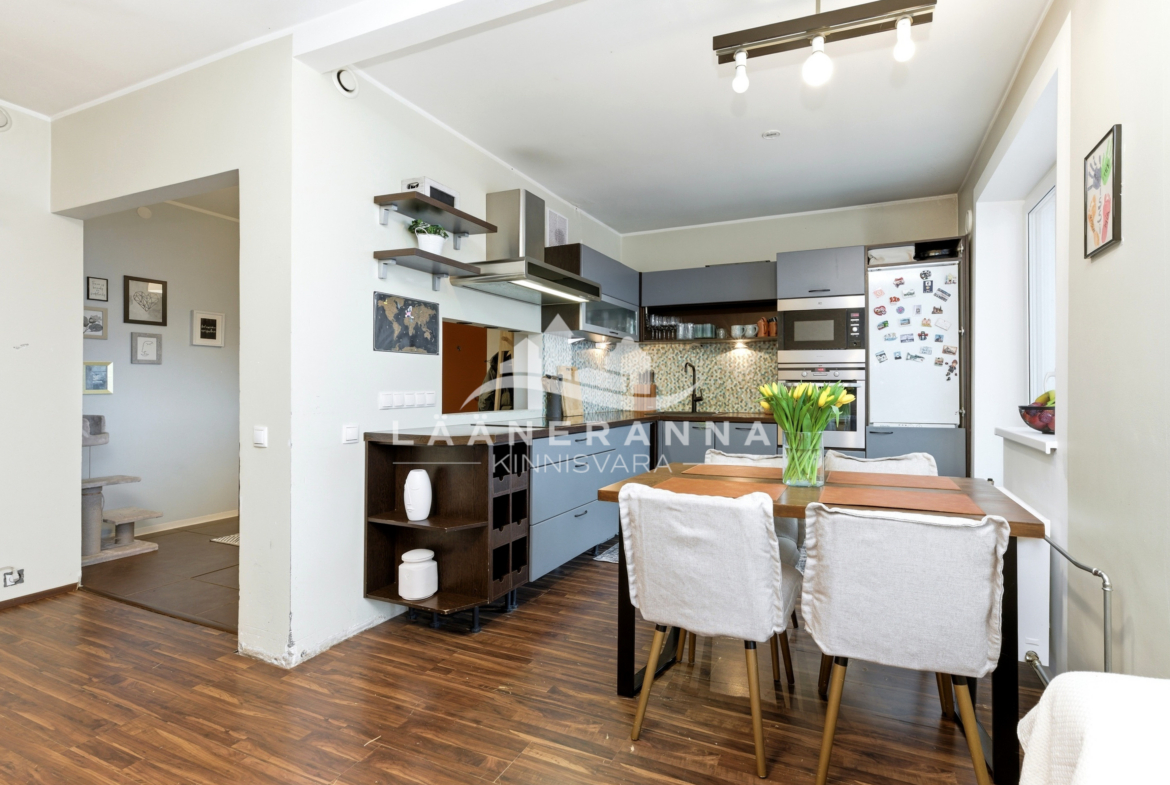 Müügis olev korter asub 5 korruselise maja viimasel korrusel. Korteri planeering on maja läbiv ning akendest avanevad vaated nii maja esisele kui tagusele alale. Korteri koosseisu kuuluvad esik, wc, vannituba, avatud köögiga elutuba ning eraldi paiknevad kolm magamistuba. Korteri kasutuses on kokku neli rõdu, millest kaks jäävad maja tagusele alale, kus saab nautida õhtupäikest ning kaks maja esisele alale, kus tervitab Sind hommikupäike. Korteri vannitoas on loodud eraldi ruum, kuhu saab hõlpsasti sisse seada näiteks leiliruumi, või seina lammutamisega hoopis avardada kogu vannituba luues mõnusalt suure pesuruumi. Korteri kasutada on ka 6m2 suurune keldirboks.